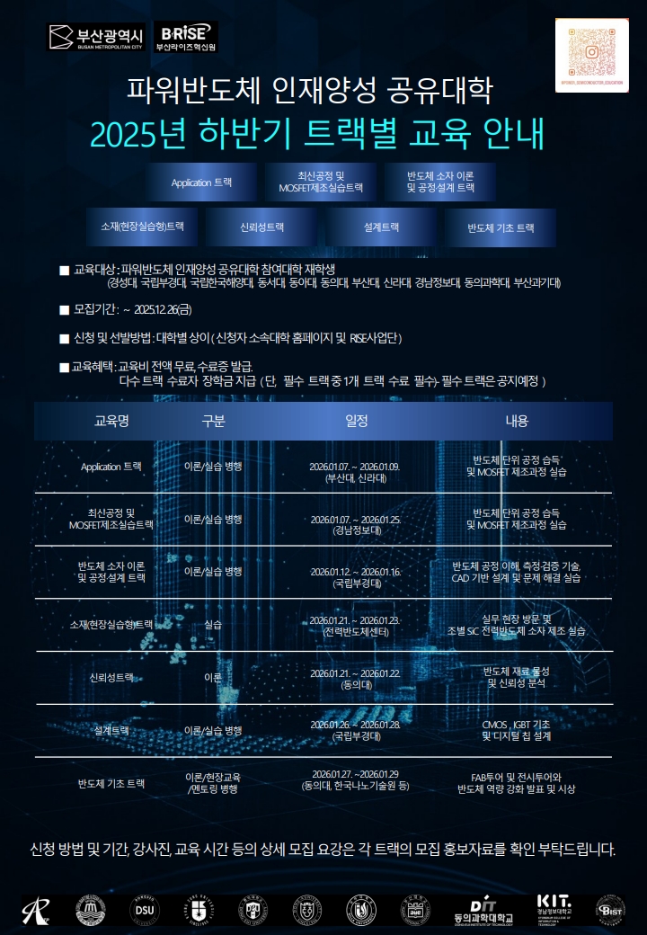 2025년 하반기 파워반도체 인재양성 공유대학 교육과정 교육생을 모집하오니 많은 참여부탁드립니다.